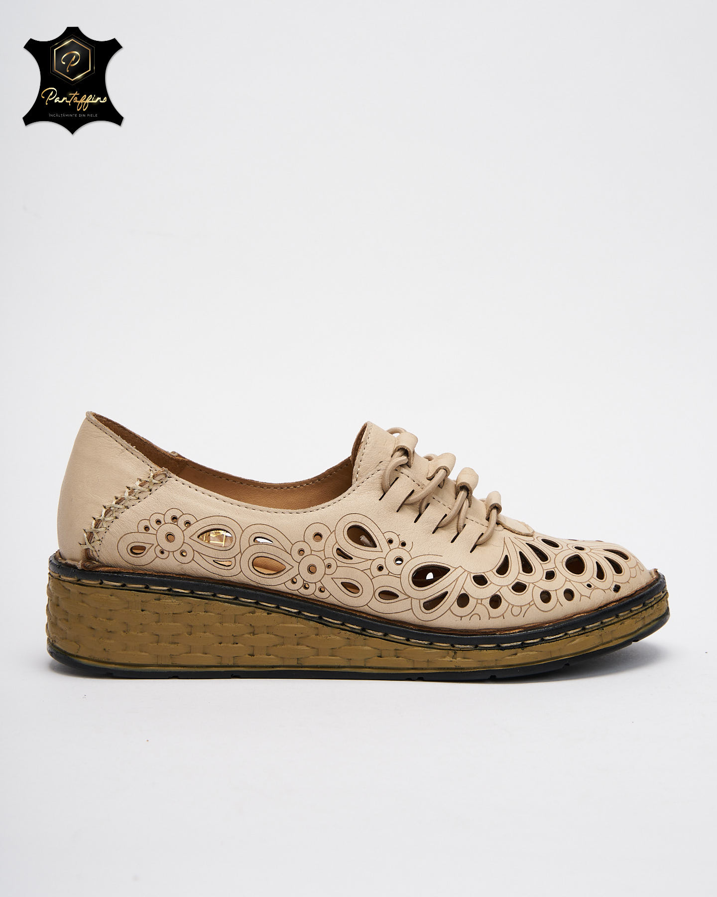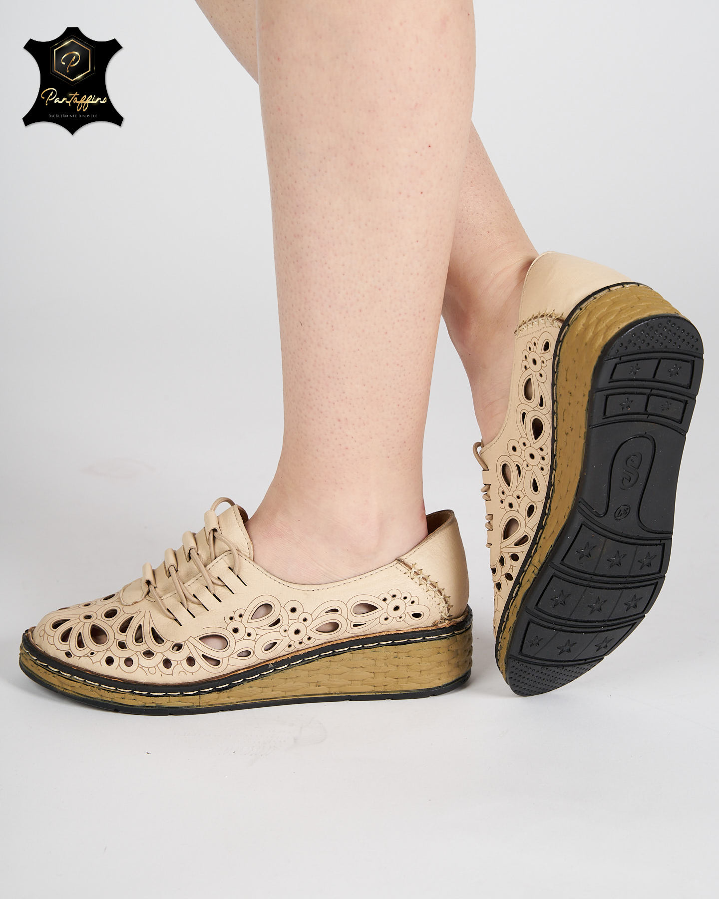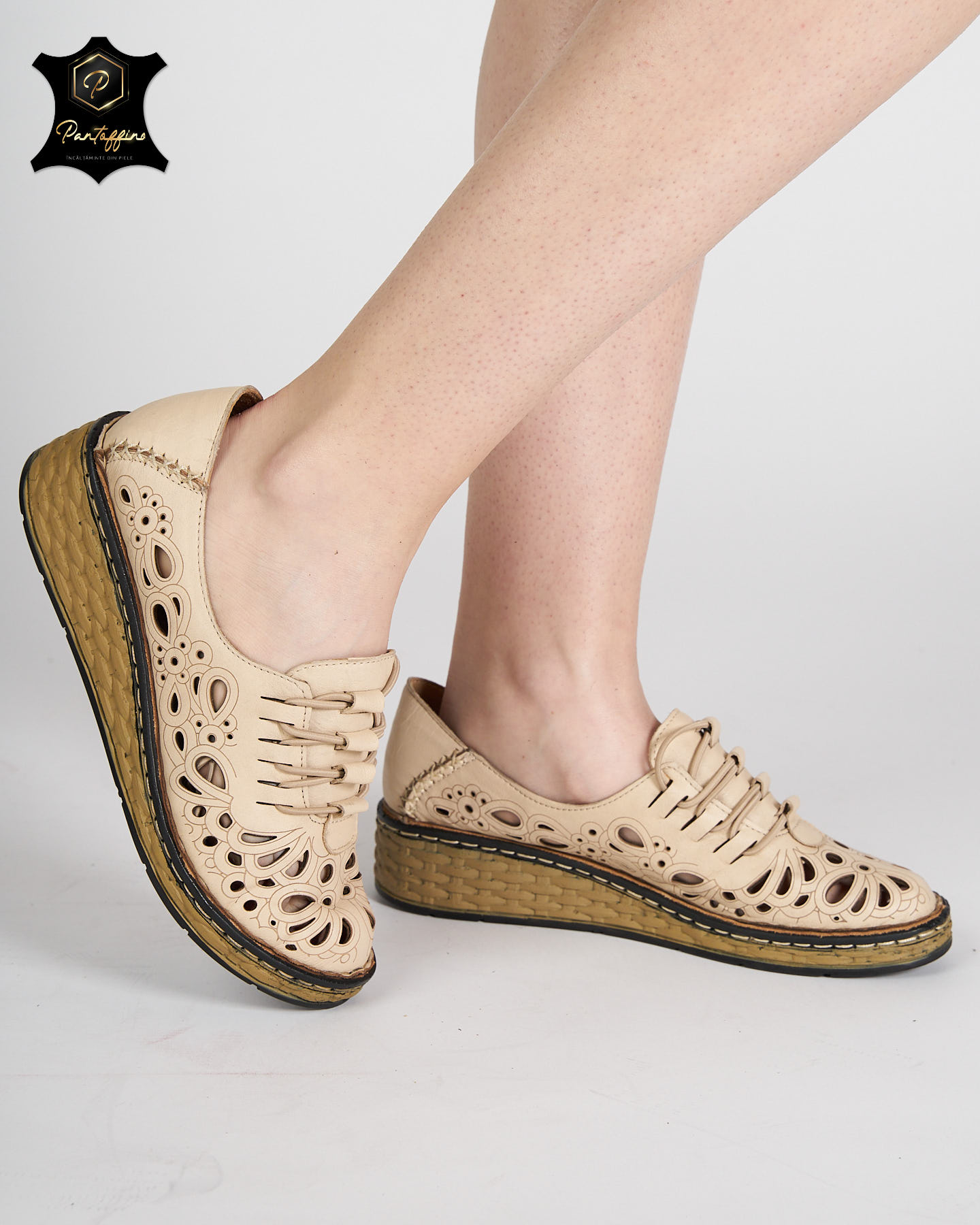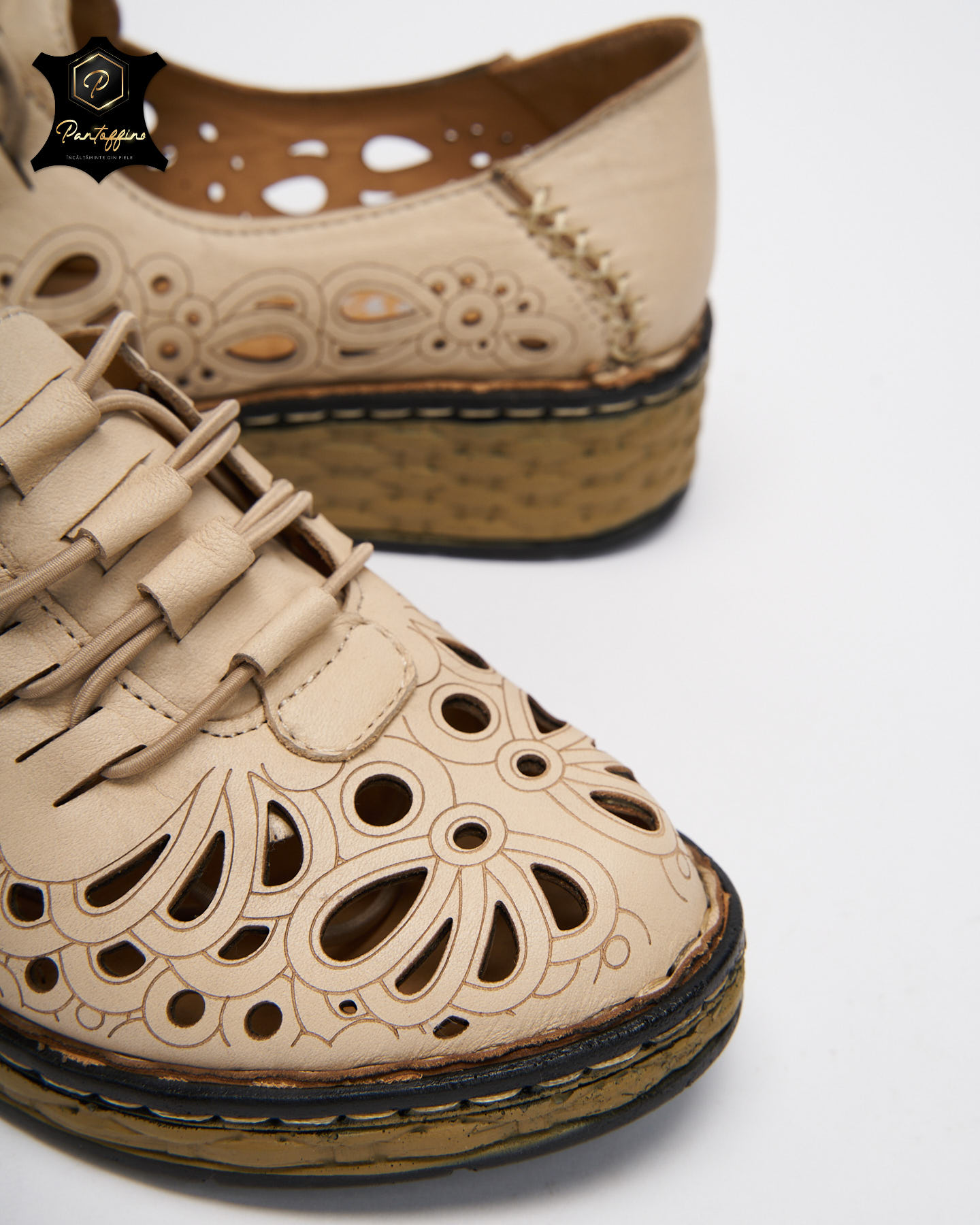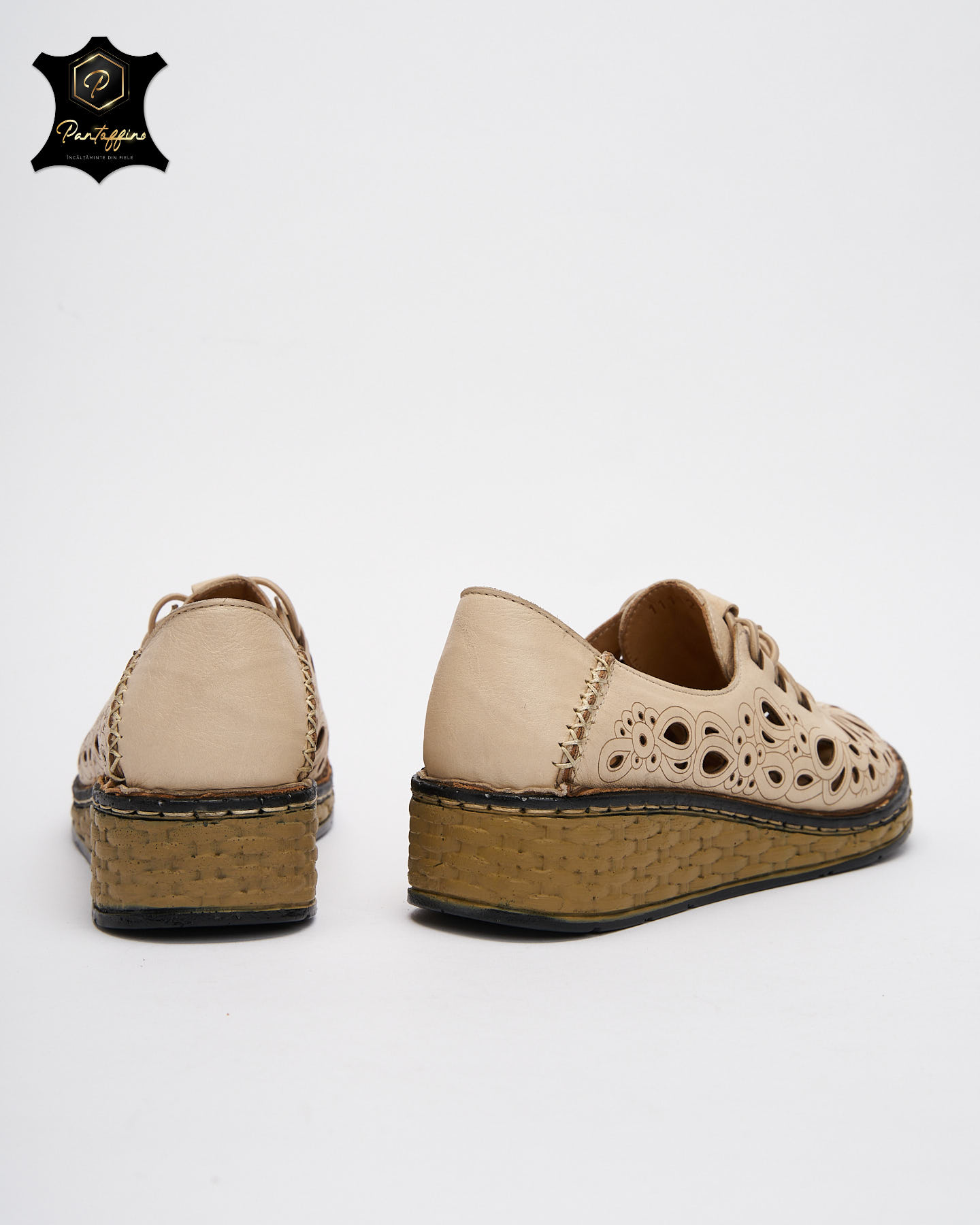 - Pantofi bej dama piele perforata – Material: Piele naturala;